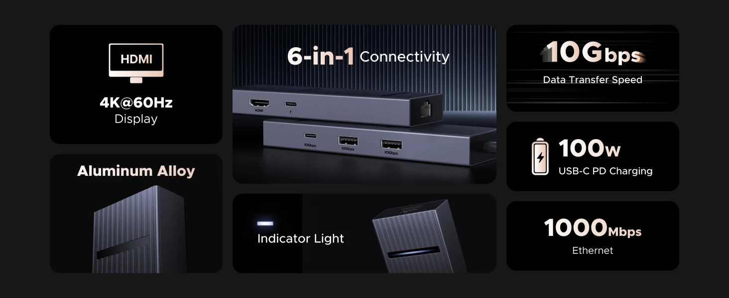 UGREEN 6 in 1 USB C HUB Gigabit Ethernet Adapter with 4K60Hz HDMI PD100W Charging 10Gbps USB A&C 3.2 Data Ports for Laptop iPad - 6-in-1 / CHINA